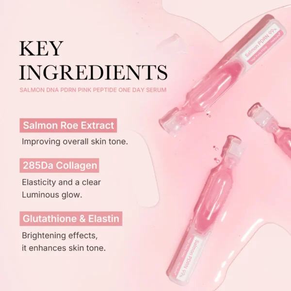 Eau, glycérine, butylène glycol, polyglycéryl-3, méthylpropanediol, niacinamide, glycéréth-26, 1,2-hexanediol, bétaïne, PEG-8, méthylglycéth-20, méthylglycéth-10, carbomère, trométhamine, panthénol, Ethylhexylglycérine, C12-14 Alketh-12, Copolymère Acrylate de Glycéryle/Acide Acrylique, Gomme Xanthane, Adénosine, EDTA Disodique, Hydrolysat de Saccharide, Cyanocobalamine, Extrait d'Œuf de Saumon, Laurate de Polyglycéryle-10, lécithine hydrogénée, élastine soluble, ADN sodique, cellulose microcristalline, hyaluronate de sodium, gomme de cellulose, acide hyaluronique, collagène soluble, crosspolyme de hyaluronate de sodium, hyaluronate de sodium hydrolysé, acide hyaluronique hydrolysé, glutathion, laurate de sorbitan, hyaluronate de sodium acétylé, hydroxypropyltrimonium hyaluronate, hydroxyéthylcellulose cétylique, ester d'acétyldipeptide-1 cétylique.